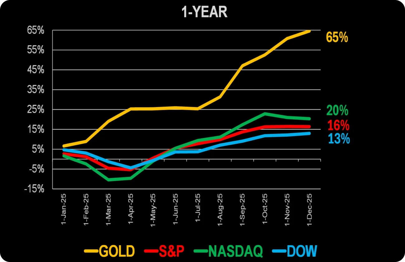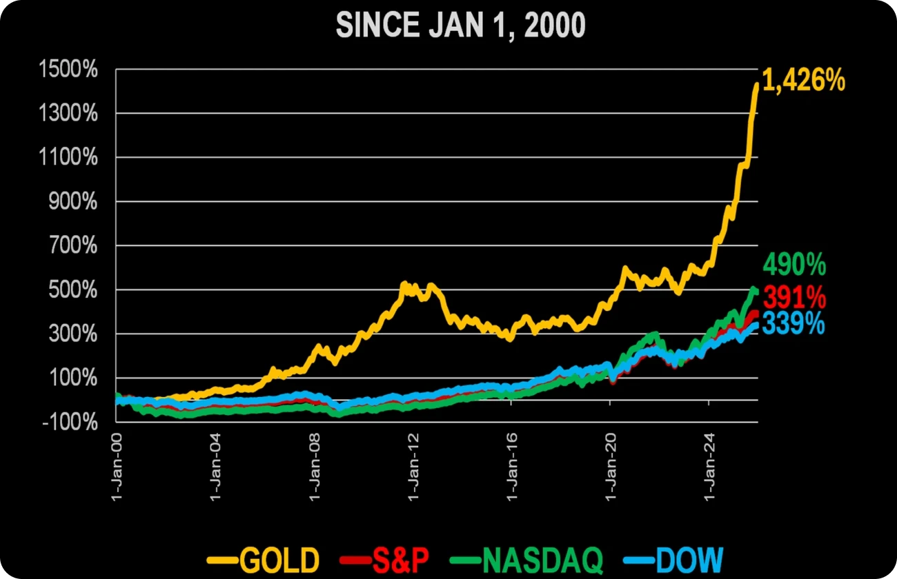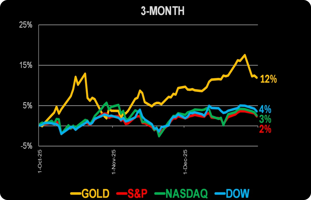Gold Price vs. S&P 500 vs. Nasdaq vs. Dow Jones ending October 31, 2025