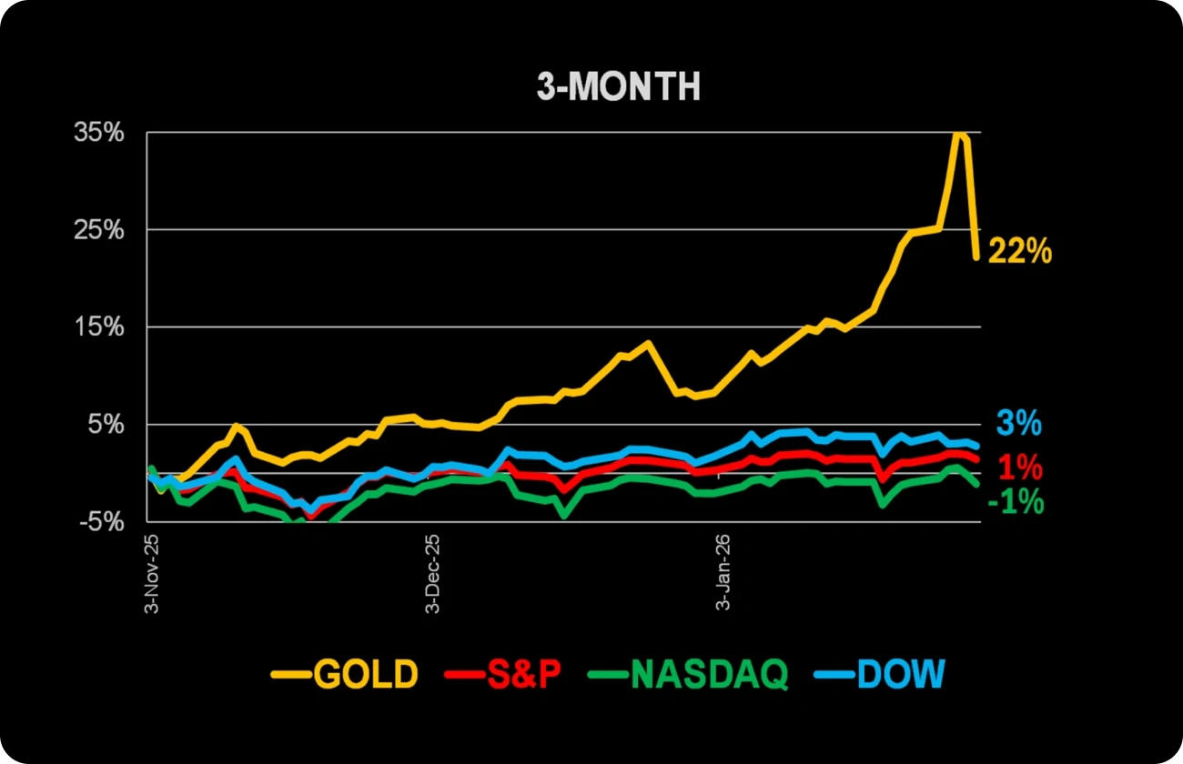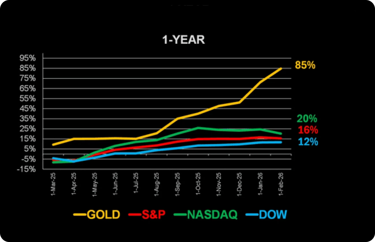 Gold Price vs. S&P 500 vs. Nasdaq vs. Dow Jones ending February 27, 2026