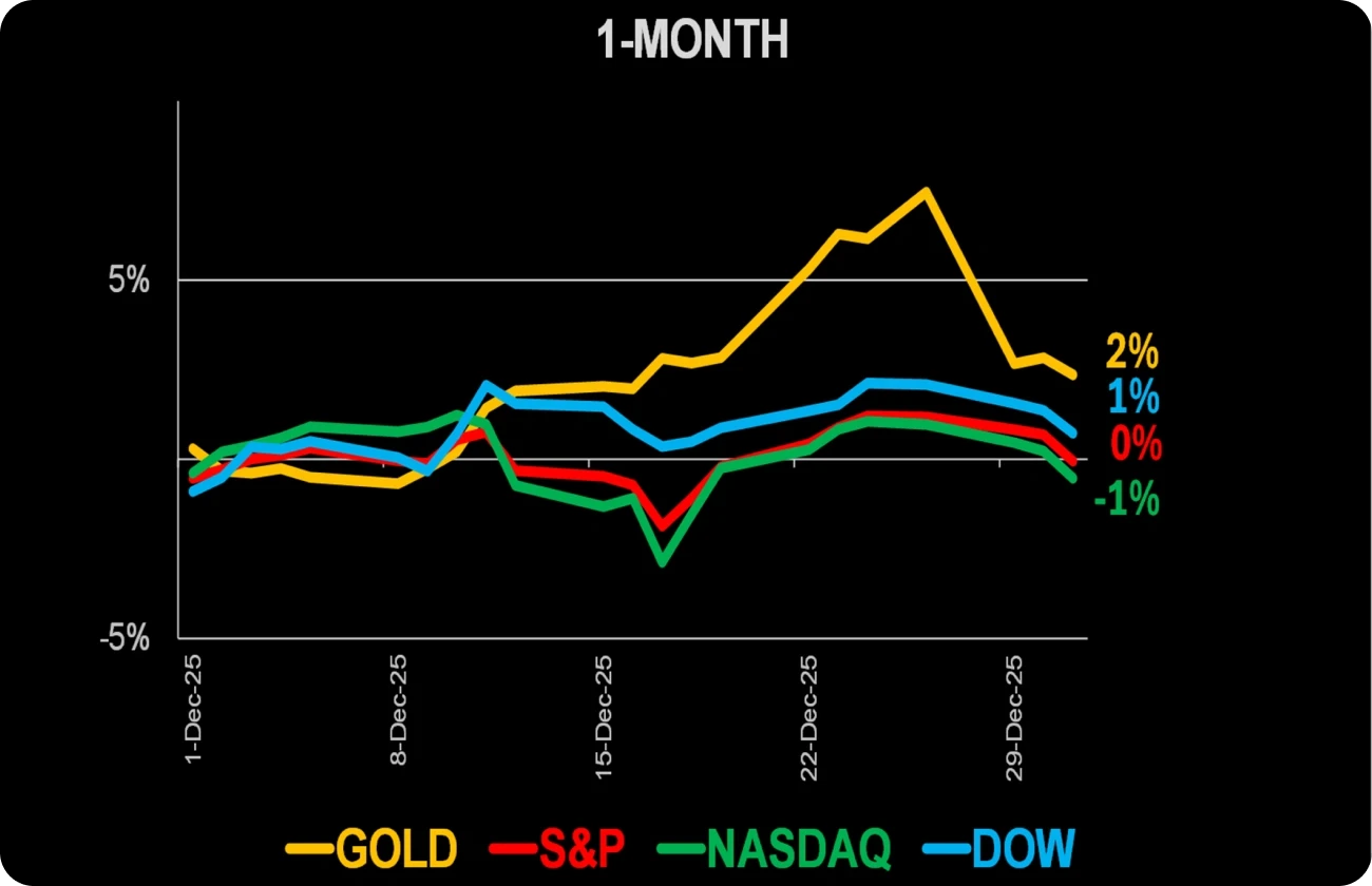 The medium‑term trend remained bullish, with gold printing higher highs and higher lows — a classic uptrend structure that persisted from October into December. The rising 50‑day moving average acted as dynamic support throughout the month, and momentum indicators like RSI stayed comfortably above neutral levels, suggesting constructive momentum without extreme overbought conditions.